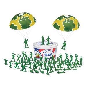 The Toy Story movies have caused a resurgence in the popularity of little green plastic army men so this ‘Bucket O Soldiers’ will be a welcome gift for either Toy Story or army toys fans. Based on characters from the movie, the bucket contains 70 2 ½ inch green plastic army soldiers in a selection of 10 poses, along with two working parachuting soldiers and various weaponry for extra excitement. The figures have sturdy bases so stand well and are easy to manipulate with little hands. The build quality and detailing are very good - far superior to most collections. The bucket with carry handle is useful for carrying the toys about and for storage. This is a great army toy sold at a great price that will stimulate the imagination. Please click the link for a more detailed review of these green army men.